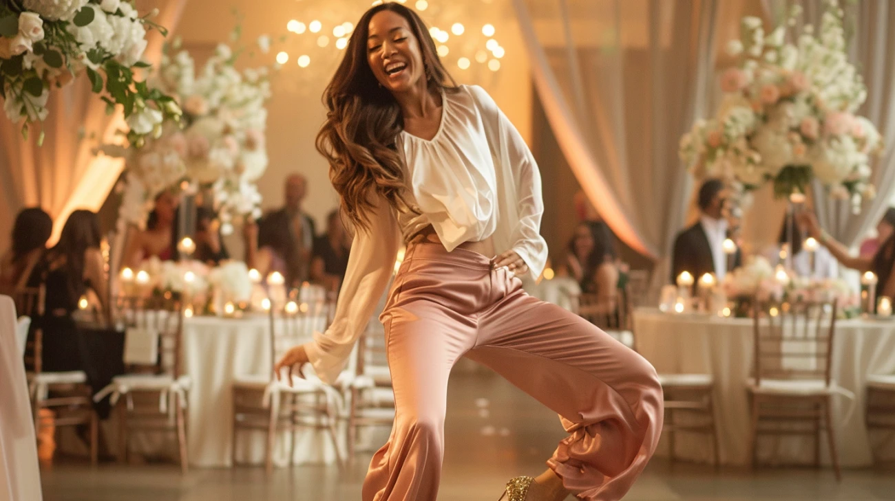 Spodnie to świetna alternatywa dla klasycznej sukienki, jeśli tylko odpowiednio je dobrać. Pozwalają cieszyć się wygodą i swobodą ruchów na weselnym parkiecie.
